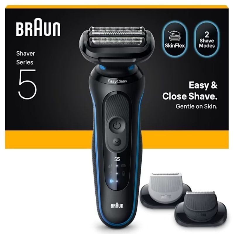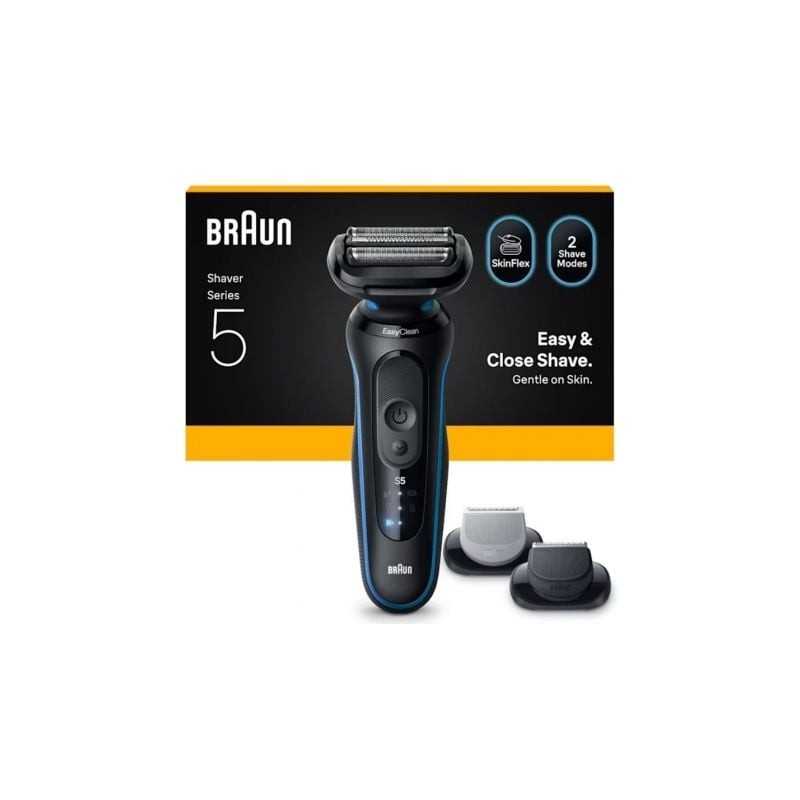 La afeitadora eléctrica Braun Series 5 ofrece un afeitado fácil y rápido. Las 3 cuchillas adaptables se adaptan cómodamente a los contornos de tu rostro. Los 2 modos de afeitado (modo Turbo y modo Estándar) le permiten ajustar el afeitado según sus necesidades. Lleva tu rutina de aseo al siguiente nivel con los accesorios Body Groomer y Beard Trimmer para un aseo y peinado versátiles. La batería de iones de litio ofrece hasta 50 minutos de funcionamiento inalámbrico y una carga rápida de 5 minutos. La afeitadora eléctrica de la Serie 5 para hombres es 100% resistente al agua.