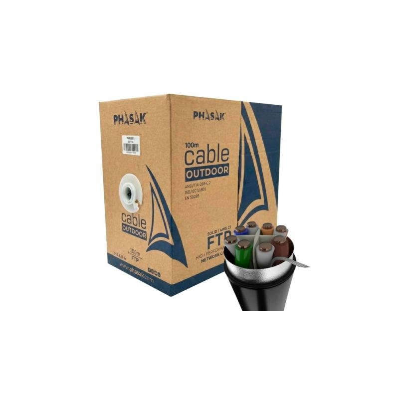 Bobina de cable de red exterior FTP Cat.6A, conductor AWG23 CCA, longitud 100 m. Ideal para tendidos en exteriores, CCTV y enlaces de datos estables en infraestructuras profesionales. Modelo PHR 681.