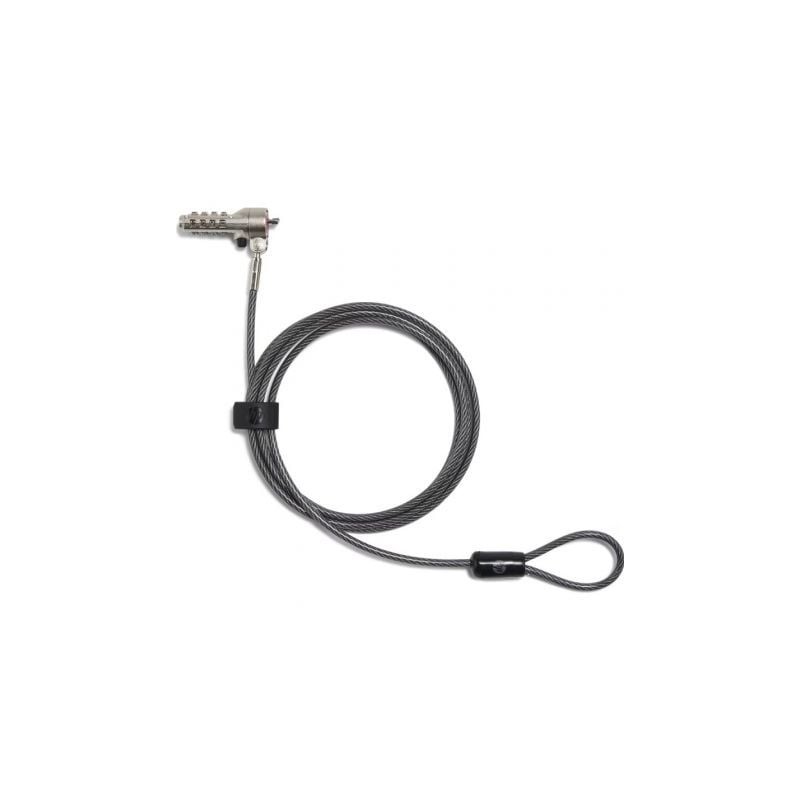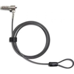 - Notas técnicas: Longitud del cable: 1,83 m (6 pies) Diámetro del cable: conjunto de acero de 3,2 mm envuelto en tubo de PVC de 4,4 mm Tipo de bloqueo: combinación de cuatro dígitos preconfigurada Material: aleación de zinc para estructura y cabezal de bloqueo, cable de acero galvanizado Ranura de bloqueo compatible: Cabezal giratorio HP Nano: 360 grados para el cabezal y el propio cable de bloqueo; 90 grados para el ángulo del cable