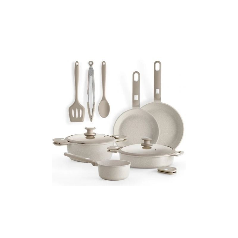 La batería incluye todo lo necesario para equipar la cocina de los cocineros más exigentes. Las sartenes, el cazo y las cacerolas son muy funcionales y perfectas para su uso diario. Su fondo difusor las hace aptas para todas las cocinas, incluidas las de inducción. Las cacerolas se pueden usar también en el horno, sin las asas de silicona y sin la tapa.