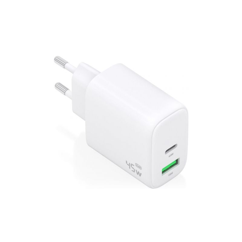A110-0971 – Cargador GaN 45W, 1xUSB-C PD3.0 QC4.0, 1xUSB-A QC3.0, Blanco