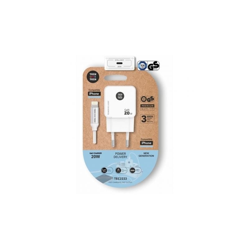 Cargador de Pared Tech One Tech TEC2222/ 1xUSB Tipo-C + Cable Lightning/ 20W/ Blanco