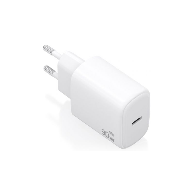 Cargador GaN USB-C de 30W diseñado para cargar portátiles, teléfonos móviles, cámaras y tablets, entre otros dispositivos. Presenta un diseño elegante, moderno y práctico.