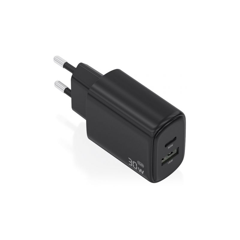 AISENS - CARGADOR GaN 30W, 1xUSB-C PD3.0 QC4.0, 1xUSB-A QC3.0, NEGRO