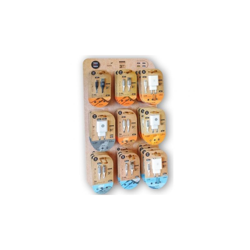 Elegante expositor de peana TECH ONE TECH, con 9 ganchos y 3 productos en cada gancho, total 27 productos de cargadores y cables más vendidos.