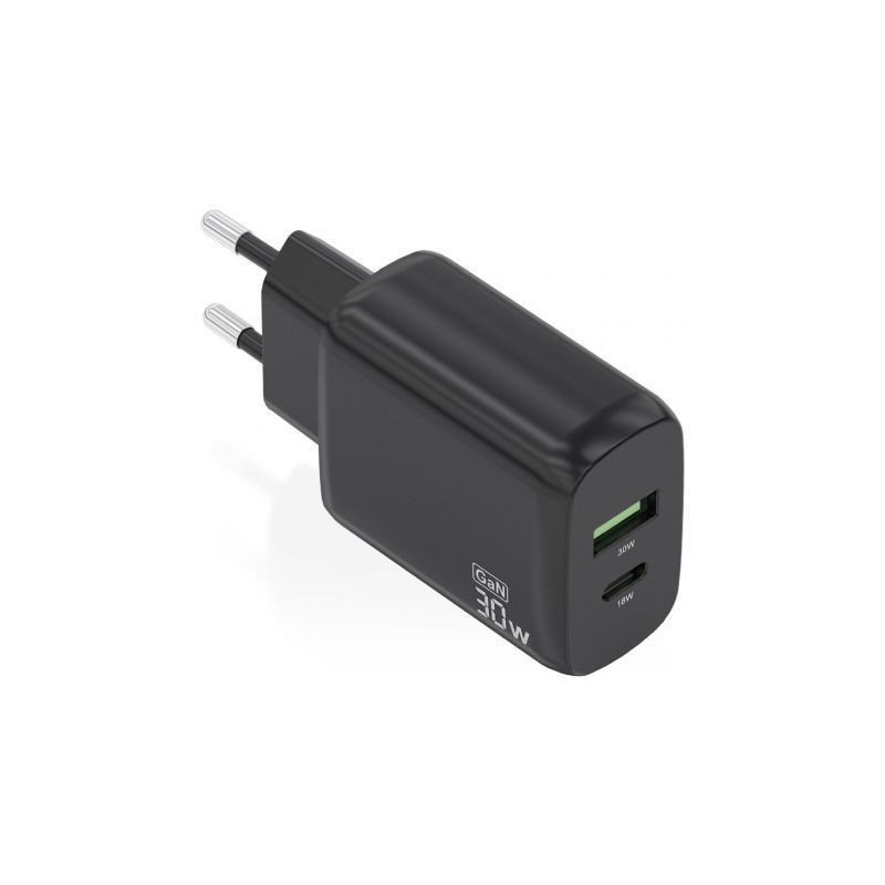 AISENS - CARGADOR GaN 30W, 1xUSB-C PD3.0 QC4.0, 1xUSB-A QC3.0, NEGRO