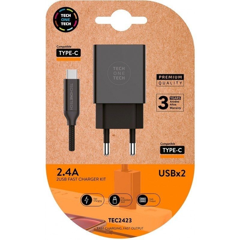 Cargador de Pared Tech One Tech TEC2423/ 2xUSB + Cable USB Tipo-C/ 12W/ Negro
