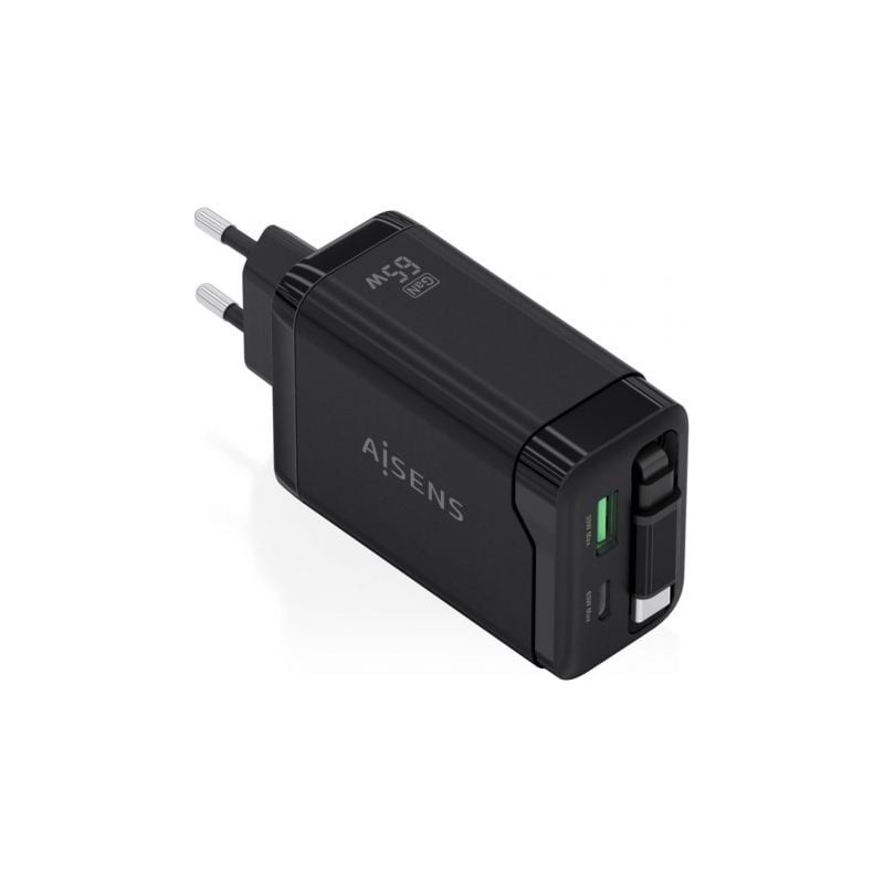 Cargador de Pared GaN Aisens ASCH-65W3P071-BK/ 1xUSB Tipo-C/ 1xUSB/ 65W/ Negro