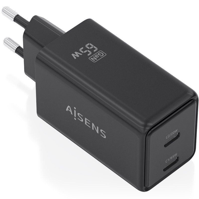 AISENS - CARGADOR GaN 65W, 2xUSB-C PD3.0 QC4.0, NEGRO