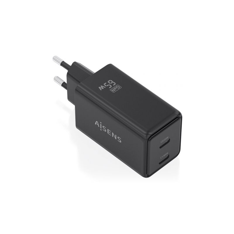 Cargador de Pared GaN Aisens ASCH-65W2P079-BK/ 2xUSB Tipo-C/ 65W/ Negro