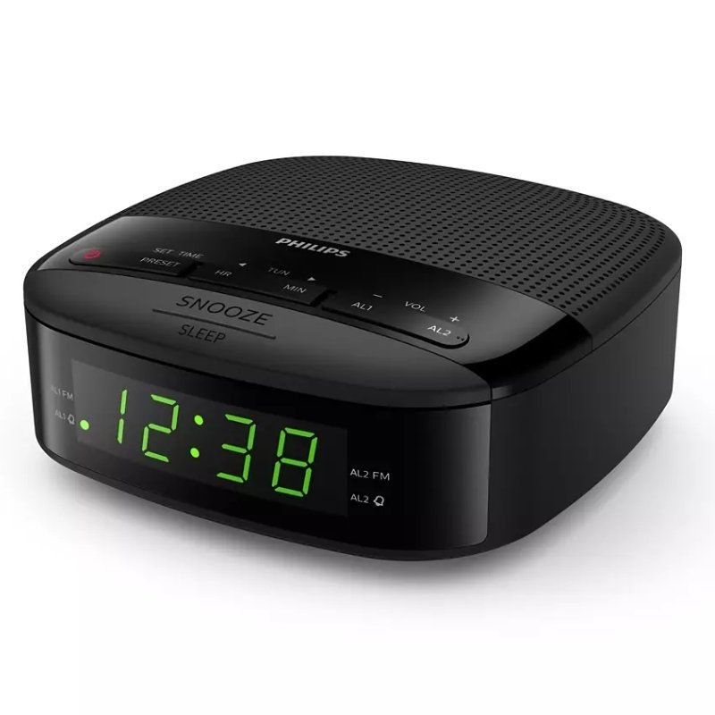 Duerme plácidamente con tu emisora favorita de fondo. Puedes configurar el temporizador del reloj para que reproduzca la radio durante un máximo de 2 horas. Una vez transcurrido el tiempo preestablecido, la radio se apagará.Alarma dual. Un reloj, dos alarmas.