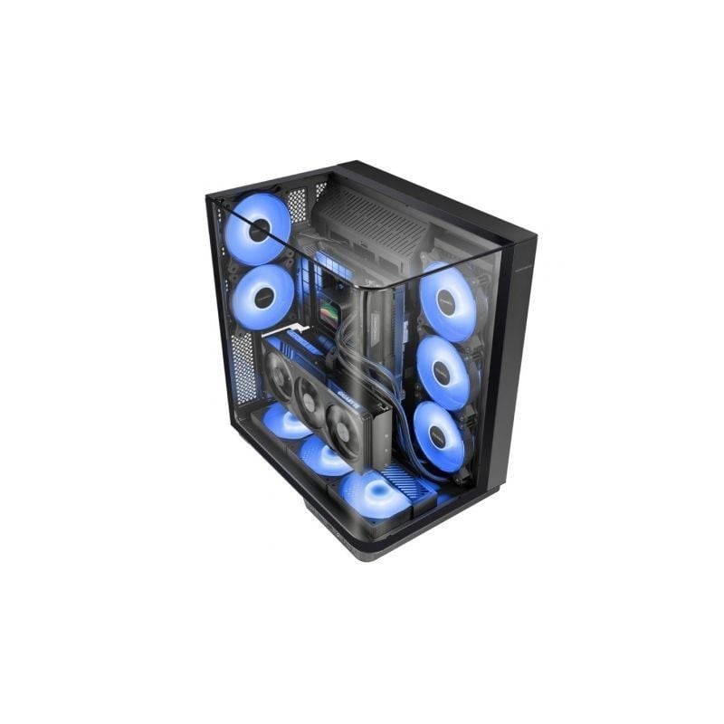 La torre MC-INFINIO lleva el diseño gaming a otro nivel con su estructura envolvente y visión panorámica sin interrupciones. Su exclusivo cristal templado curvado horizontal, extendido en una sola pieza desde el frontal hasta el lateral, junto con un panel superior de cristal, crean un efecto fluido y sin marcos que realza cada componente e iluminación ARGB. Equipada con 2 ventiladores ARGB traseros preinstalados, soporte para hasta 8 ventiladores y refrigeración líquida de hasta 360mm, garantiza una disipación térmica. Su sistema de instalación vertical para GPUs, compatibilidad con tarjetas gráficas de hasta 383mm, bahías de almacenamiento versátiles y conectividad avanzada con USB-C la convierten en una opción perfecta en rendimiento, personalización y estética.