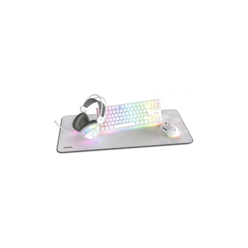 Krom Klass es el primer pack gaming que incorpora un teclado mecánico que se une a nuestro catálogo. Su diseño blanco le hace destacar y lo convierte el pack gamer perfecto para darle un toque distintivo a tu setup. Este combo está formado por un teclado mecánico TKL que incorpora la tecnología anti-ghosting, unos distintivos auriculares estéreo con micrófono integrado, un ratón ergonómico capaz de alcanzar 7200 DPI y una amplia alfombrilla speed. Llena tu setup de estilo con este pack de Krom total white.