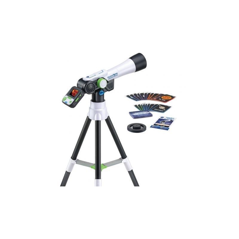 Trípode desmontable, telescopio con foco y tapa, y dial de enfoque, manivela de nivelación, clavija de ajuste de ángulo de visión, compartimento para tarjeta microSD (no incluida) y pantalla LCD a color de ajustable con botones de Zoom y botones para interactuar con juego