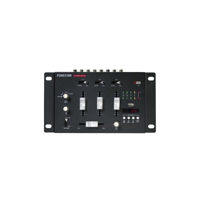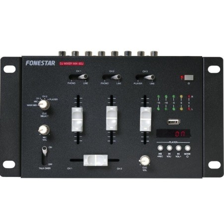 - Mezclador DJ compacto de 3 canales estéreo y 1 micrófono.