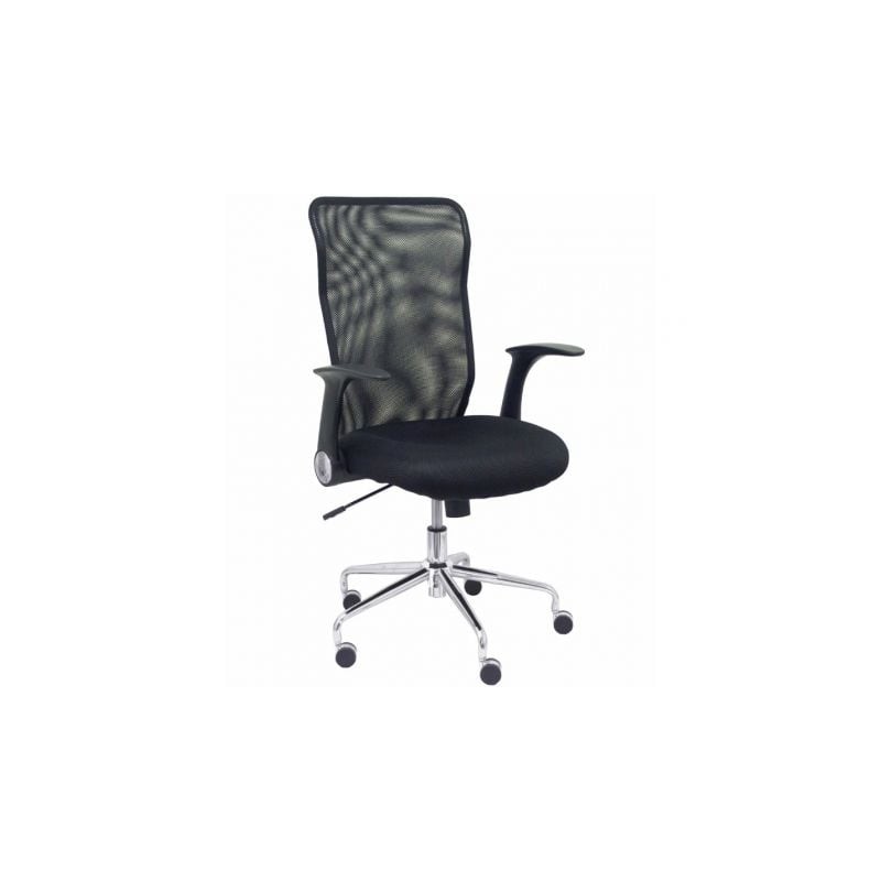 Silla de oficina Minaya con mecanismo Basculante tapizada con Tela color Negro. Equipada con Base cromada, Brazos abatibles y Ruedas de nailon 50 mm