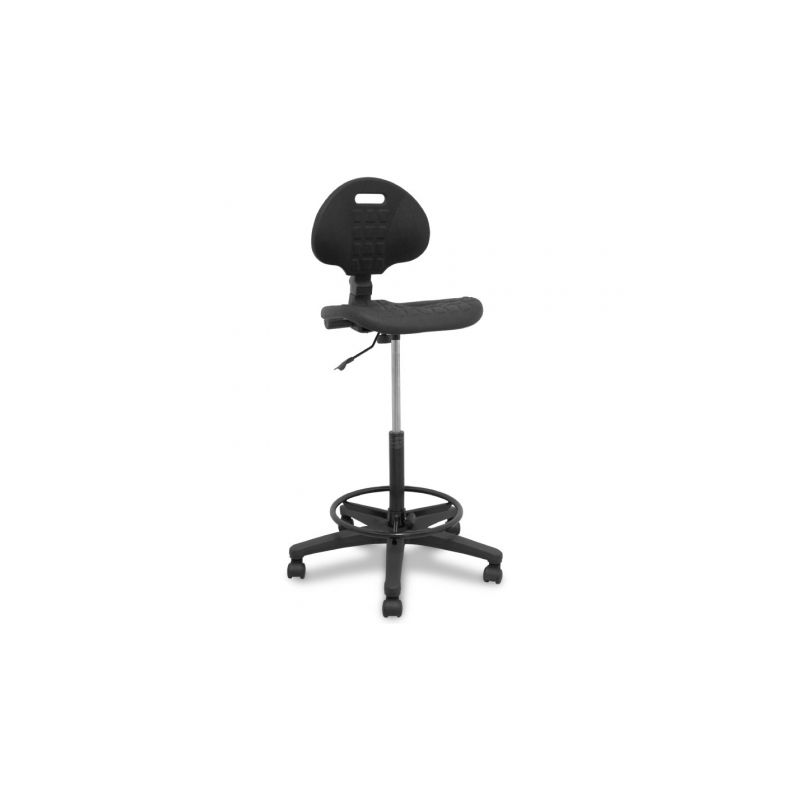 Taburete giratorio sin brazos, contacto permanente. Aro regulable en altura.