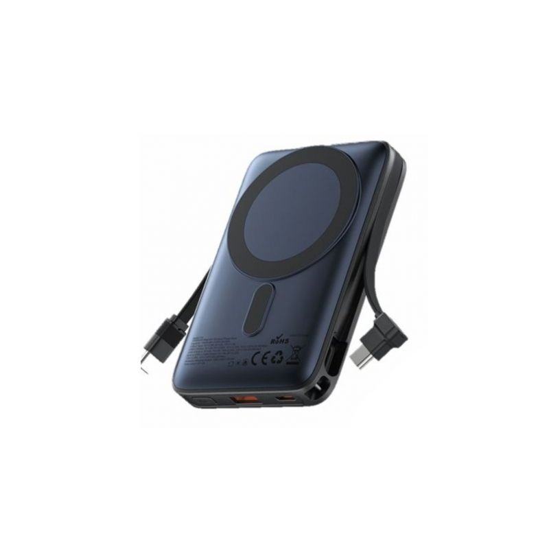 Batería externa magnética de 10,000 mAh (USB-C + USB-C/USB-A/Inalámbrico) con cable incorporado y soporte. Potencia de salida: 22.5 W Pantalla LED blanca Material: ABS con recubrimiento UV Soporte de aleación de aluminio