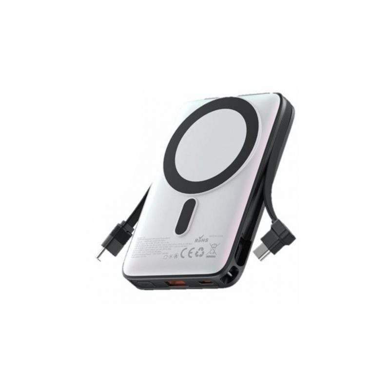 Batería externa magnética de 10,000 mAh (USB-C + USB-C/USB-A/Inalámbrico) con cable incorporado y soporte. Potencia de salida: 22.5 W Pantalla LED blanca Material: ABS con recubrimiento UV Soporte de aleación de aluminio