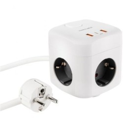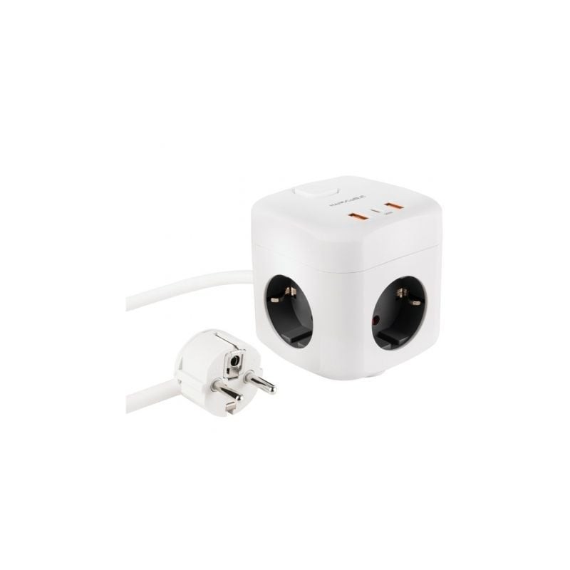 Regleta compacta en formato cubo con 3 enchufes de 16A y 3 puertos USB (2x USB-A + 1x USB-C).