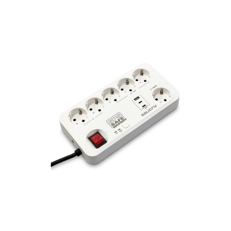 Protege tus dispositivos electrónicos de las imprevisibles fluctuaciones eléctricas con la gama SPS SAFE S de Salicru. Una gama que ofrece entre 4 y 6 tomas de corriente CA, y dos modelos que integran dos puertos USB-C y un puerto USB-A de carga de hasta 20W, garantizando una protección fiable contra picos de tensión, rayos y contaminación eléctrica. Son ideales para portátiles, consolas de videojuegos, altavoces y otros equipos electrónicos de tamaño medio, proporcionando también una carga segura para tus dispositivos móviles.