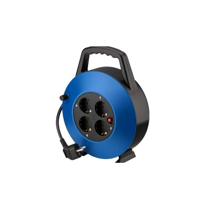 Regleta enrollable con 4 tomas Schuko, protección contra sobretensión y cable 10 m (H05VV-F 3G 1,5 mm²). Carcasa azul/negra con asa y recogida cómoda. 3000 W · 16 A · 230 V.