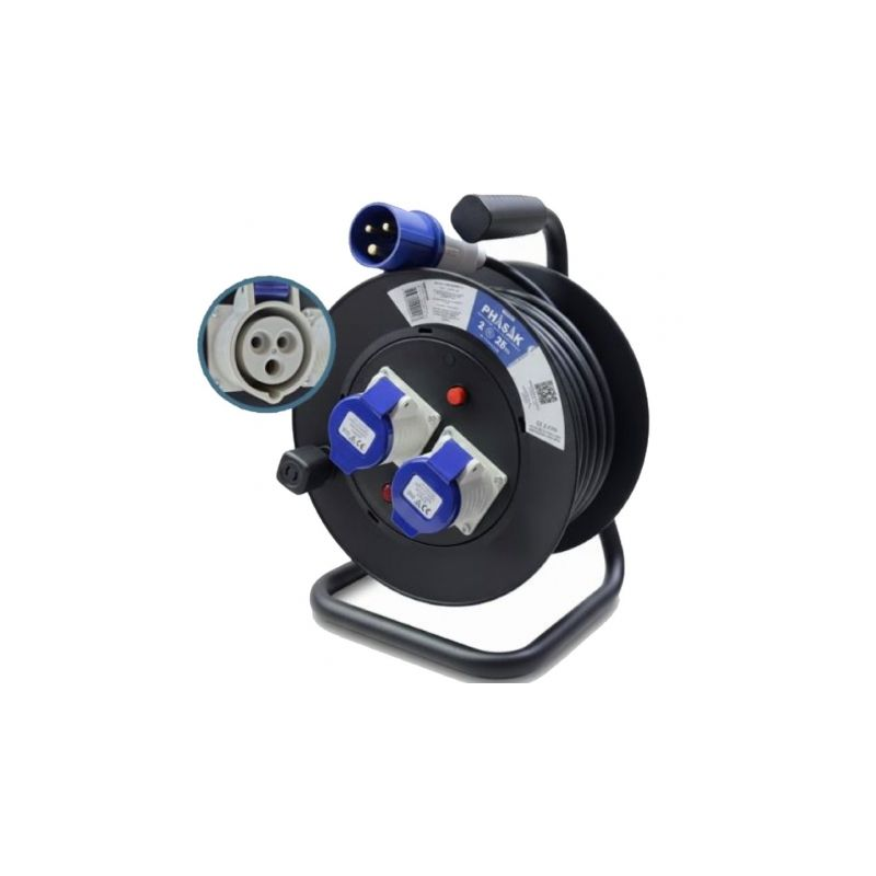 Regleta enrollable PHASAK 2× enchufe industrial 2P+TT con protección – 25 m (BN 3475)