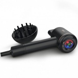 Secador de pelo iónico negro con una potencia de 1600W, el motor BLDC sin escobillas y tecnología iónica. Tiene Display LED trasero, 3 niveles de velocidad y 4 niveles de temperatura con función de aire frío. Su diseño es ultraligero e incluye concentrador y difusor.