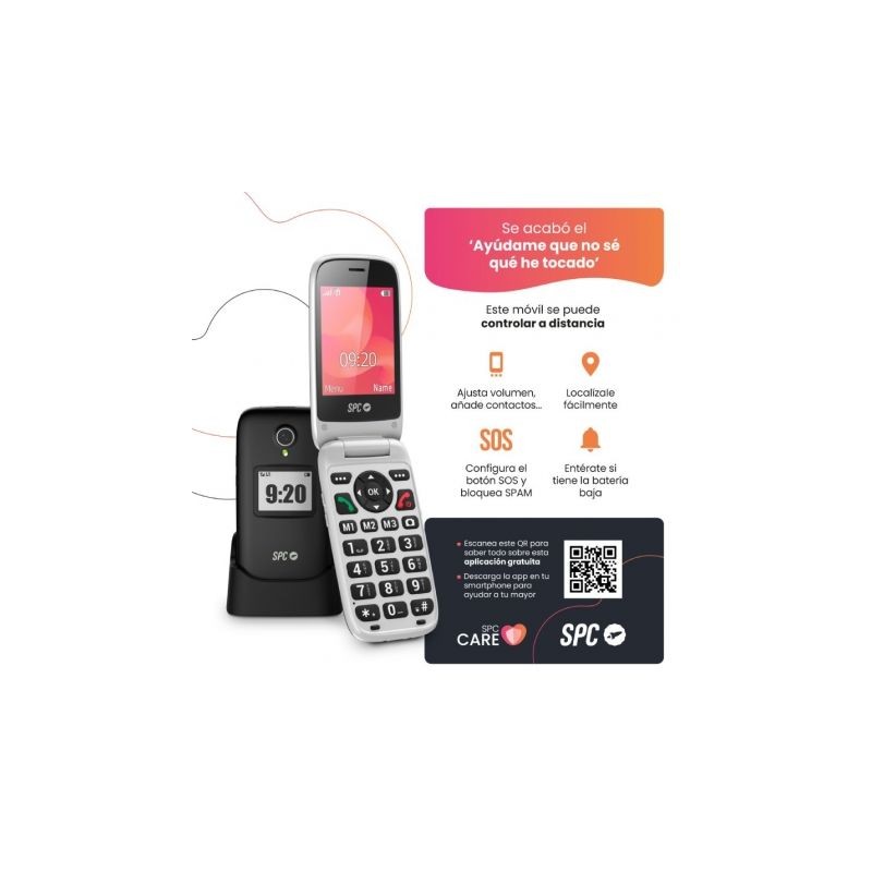 Teléfono móvil para personas mayores compatible con la aplicación de control remoto SPC Care. Con conexión 4G, botón SOS, 2 pantallas, 3 memorias directas y compatible con audífonos.