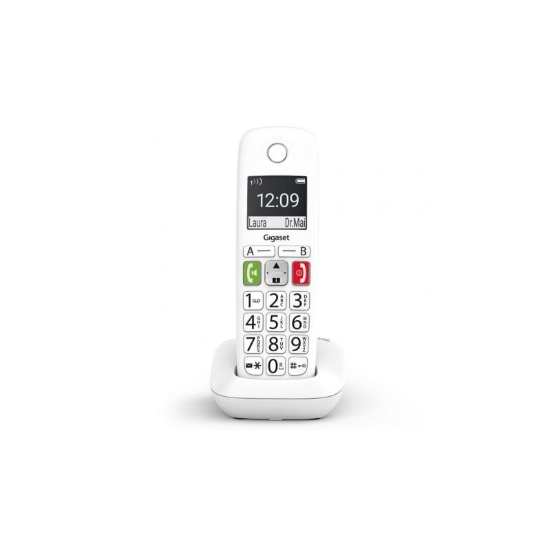 Si el simple hecho de marcar un número de teléfono es sencillo, el resto de la experiencia telefónica será mucho más agradable. Esta es exactamente la razón por la cual el teclado ergonómico del teléfono de teclas grandes Gigaset E290 ahora hace que usar el teléfono sea lo más cómodo posible. Las teclas grandes están iluminadas y claramente etiquetadas para garantizar una buena legibilidad. Puede guardar contactos particularmente importantes, como personas para llamar en caso de emergencia, en una de las dos teclas de repertorio (A y B). La función de llamada directa es útil si solo desea poder llamar a un número desde el teléfono. En situaciones difíciles, puede presionar cualquier botón y se marcará el número que haya almacenado.